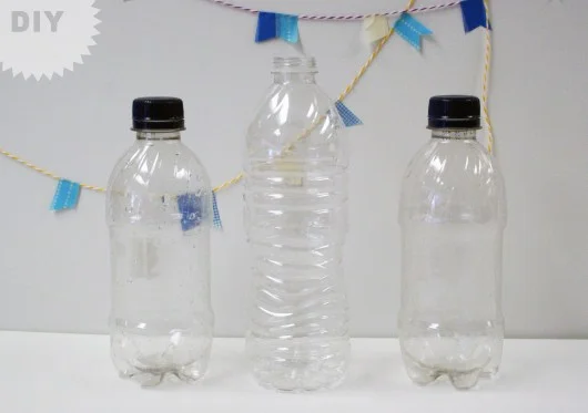 1. Select a plastic bottle to use as your new dog toy. Then cut three to four 1″ wide strips of fabric off one of the edges of your fabric. These will be used later as ties, a piece of ribbon would also work for this purpose.